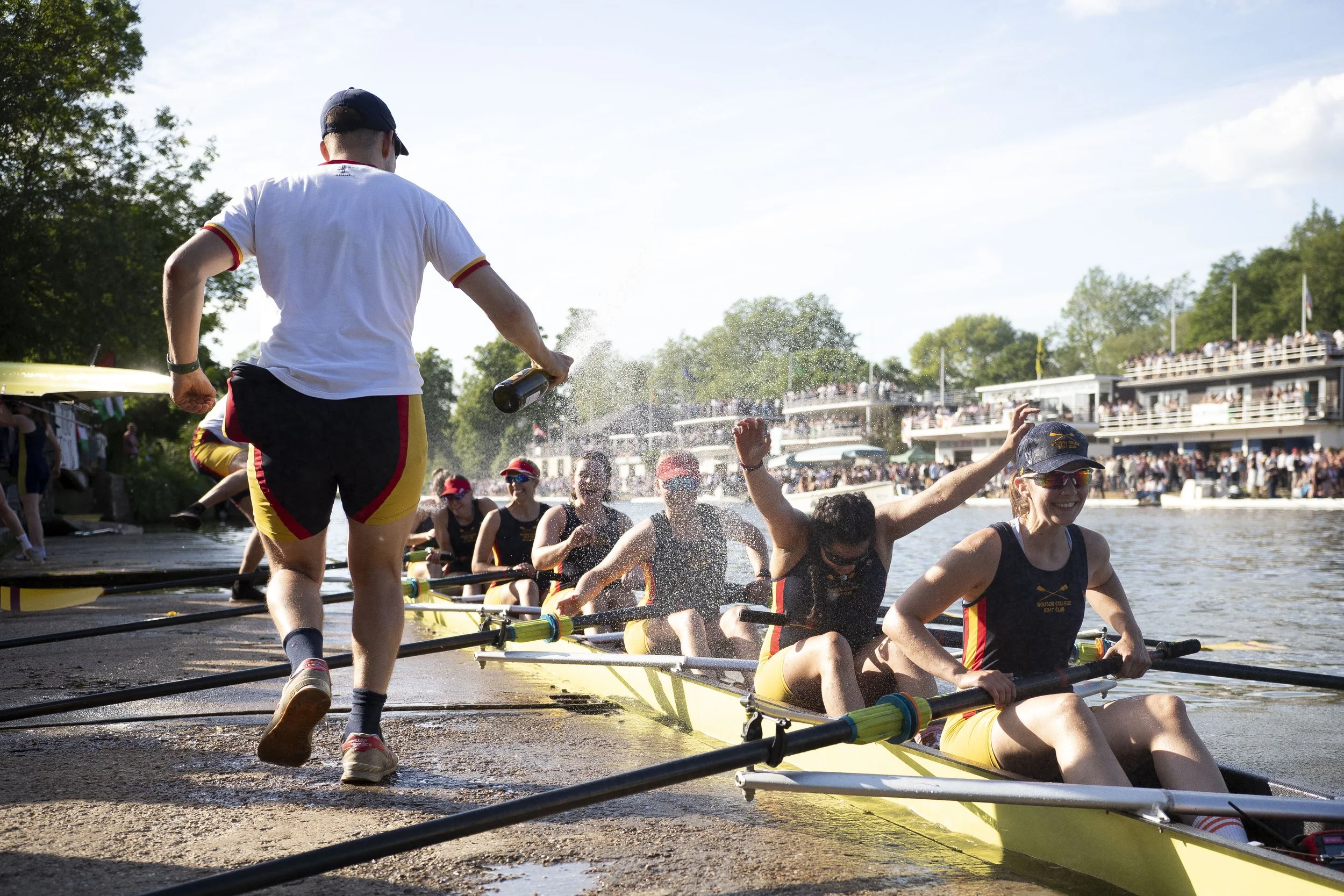 United Kingdom, Oxford 25 May 2024: Participants celebrate after finishing the annual Summer Eights regattas at the University of Oxford‘s main intercollegiate rowing event of the year. Taking place on the Isis, a length of the River Thames. The first amateur races between organised clubs in Oxford, however, date back to 1815. This is the year that crews from Brasenose College and Jesus College raced for the Head of the River, from Iffley Lock to Mr King’s Barge.