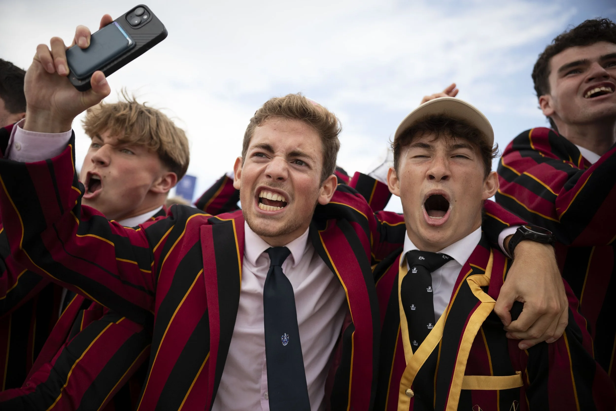 United Kingdom, Henley-on-Thames, 06 July 2025: Supporters cheer on Shiplake Coll after they won against Oxford Brookes University on the final day of the Henley Royal Regatta. The annual rowing event was established on 26 March 1839 and is considered the most prestigious of the rowing regattas.