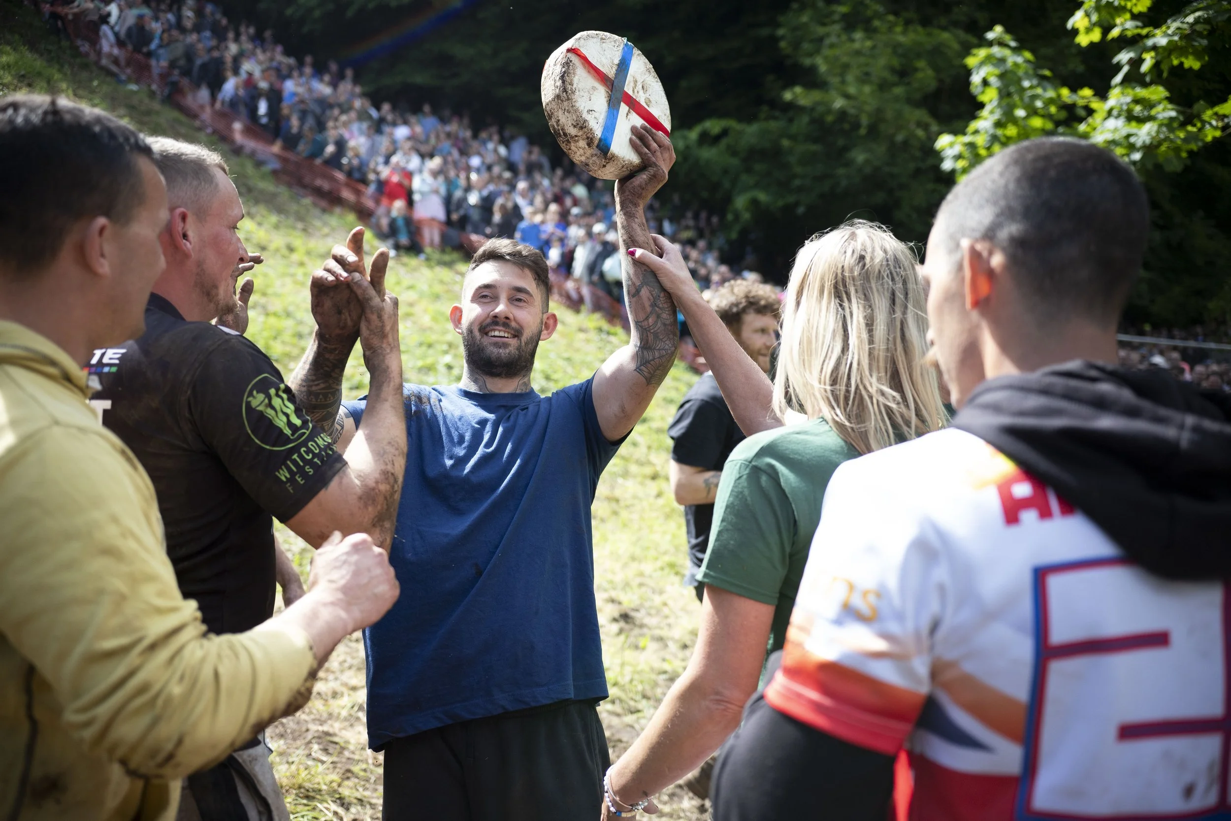 United Kingdom, Gloucester 27 May 2024: Josh Shepherd celebrates winning the third men’s race of the day after taking part in the ancient folk tradition of Cheese Rolling on Coopers Hill. The globally famous event sees an 8lb wheel of Double Gloucester Cheese, which can reach speeds of up to 70mph, thrown down the near vertical hill while competitors throw themselves down it with the aim of being the first down and the winner of the cheese.