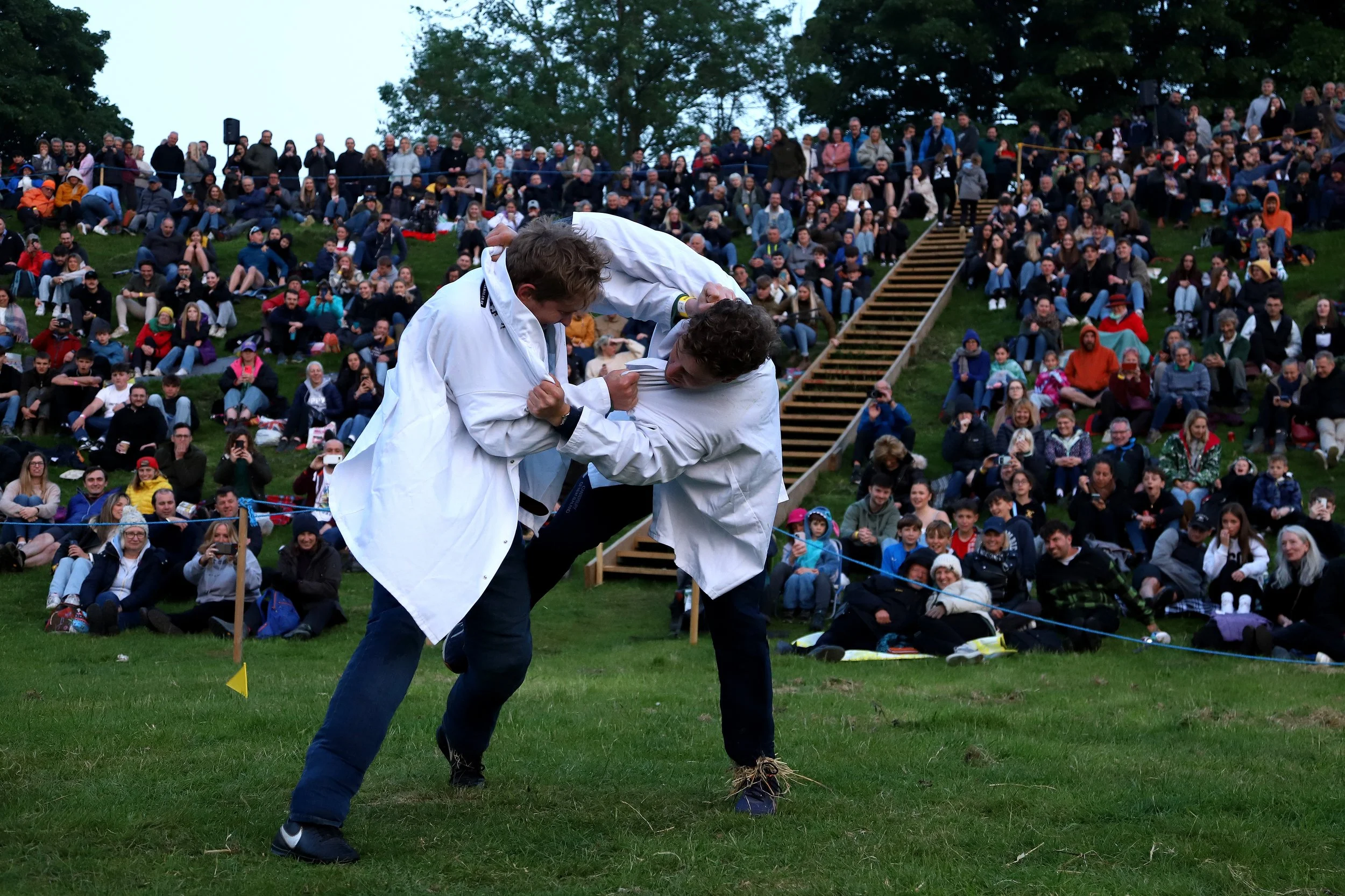 United Kingdom, Gloucester 31 May 2024: Contestants take part in the annual World Shin Kicking Championship at Dover's Hill in the North Cotswolds.