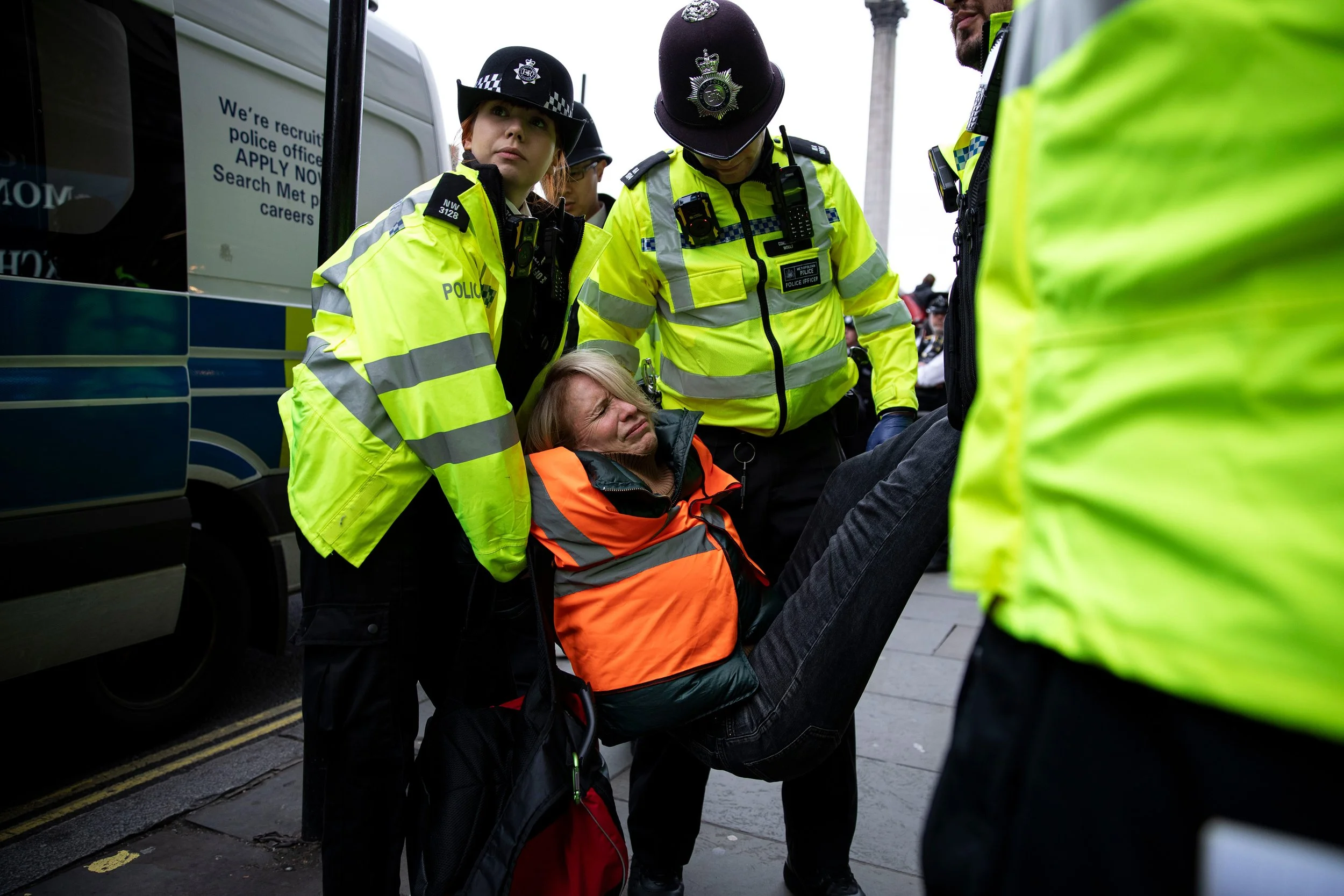 United Kingdom, London 22 November 2023: Just Stop Oil protesters gather in Trafalgar Square this afternoon. The group are calling for the UK Government to halt all future licensing of fossil fuels and vow to continue their actions until this happens.